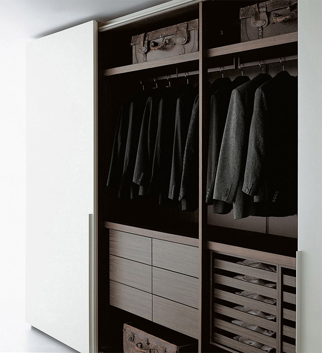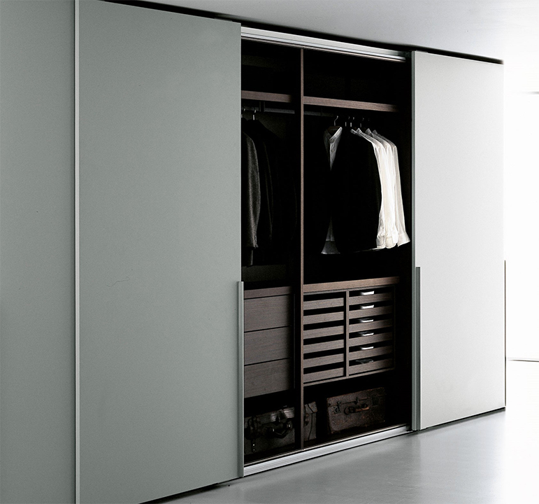 W garderobie Hettich możesz zamontować drzwi podwieszając je firmy Indeco wykonane z płyty, ze szkła lakierowanego, plyty lub łączone szkło/płyta fornirowana np. lub z ramek do szkła firmy Zobal,