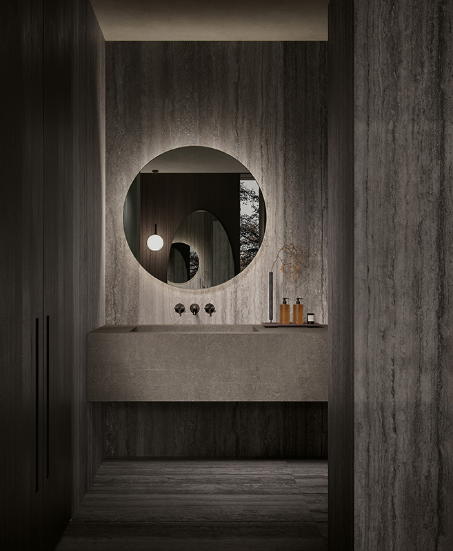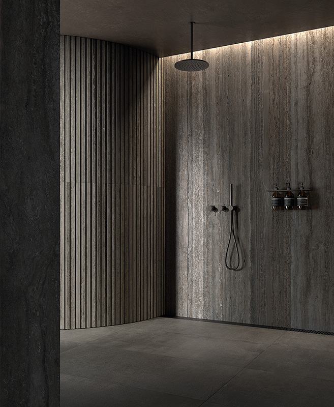 Projekt łazienki z wykorzystaniem płyt wielkoformatowych Kronos Ceramiche z kolekcji Nativa.
