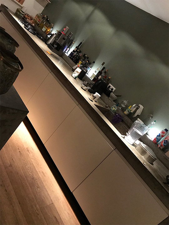 Fronty z uchwytem frezowanym. Lakier ICA antypalcowy.blat CORIAN Kuchnie z powłoką antypalcową (anti fingerprint) stanowią doskonałe rozwiązanie dla tych, którzy szukają połączenia wygody, zdrowia i czystości. Fronty nowoczesnych kuchni wyposażone są w specjalną powłokę antypalcową, która zapobiega pozostawaniu odcisków palców na powierzchni mebli. Dzięki temu nie musicie spędzać zbyt dużo czasu na ciągłym sprzątaniu, gdyż odciski palców po prostu nie pozostają na powierzchni. Duży blat pomiędzy salonem a kuchnią zastąpił stół, dużą przestrzenią roboczą.