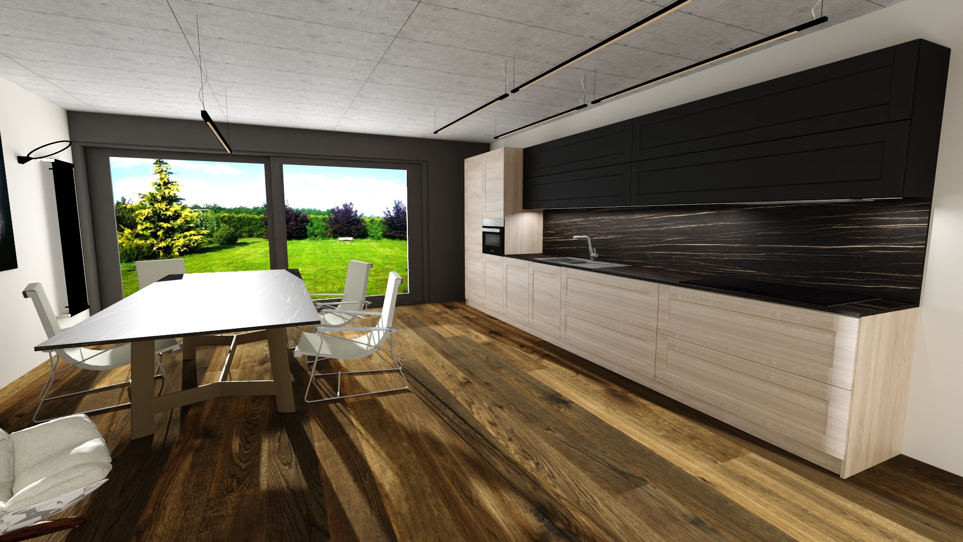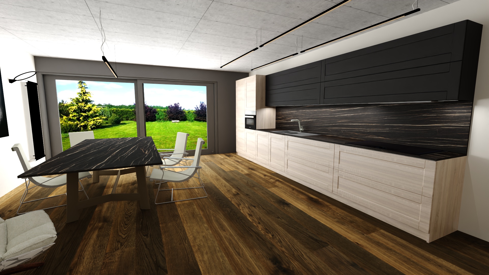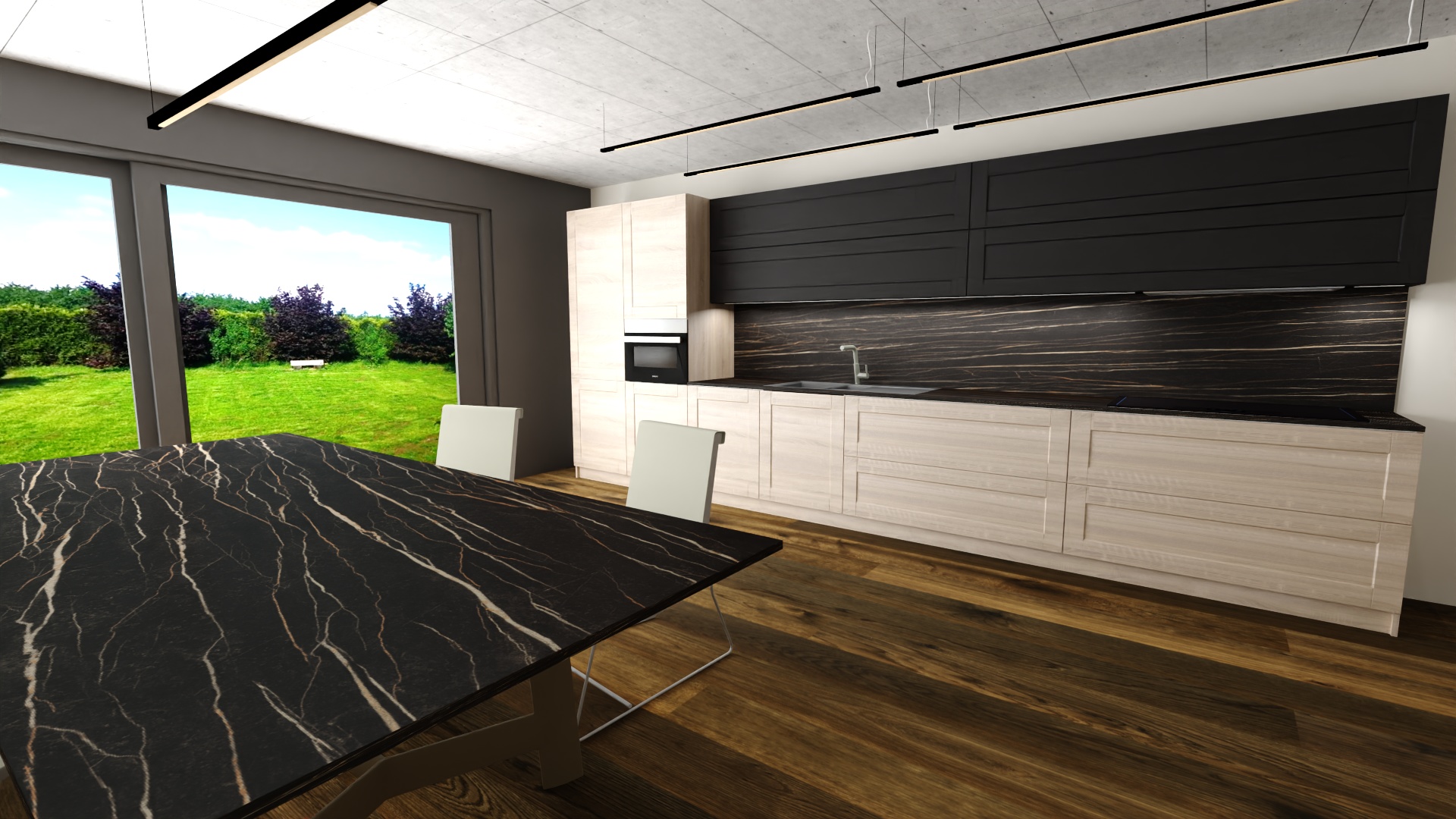 Projekt aranżacji kuchni ze spiekiem, frontami drewnianymi z połączeniem frontow lakierowanych. Różne warianty oświetlenia pozwalają zaobserwować jak doświetlone może być pomieszczenie i kuchniaw świetle dziennym, nocnym i słonecznym. Adaptacja podłogi to ważny element wykończenia, demonstruje równowagę pomiędzy płytkami a wykończeniem w drewnie.