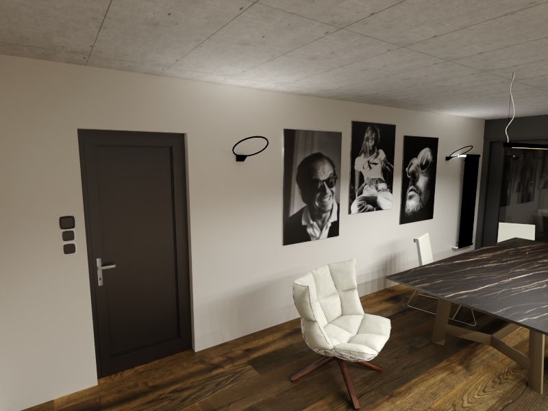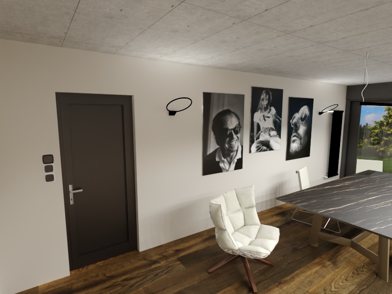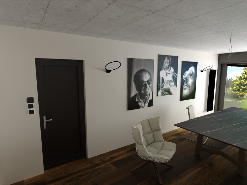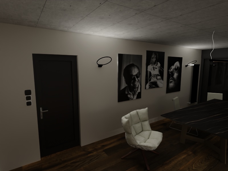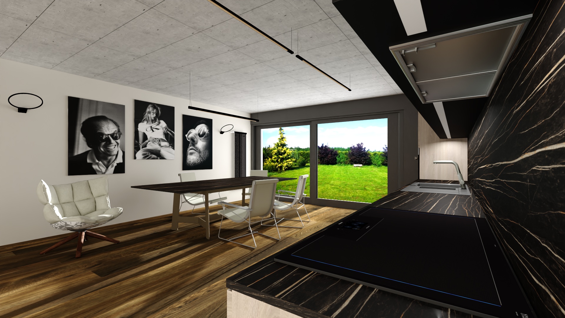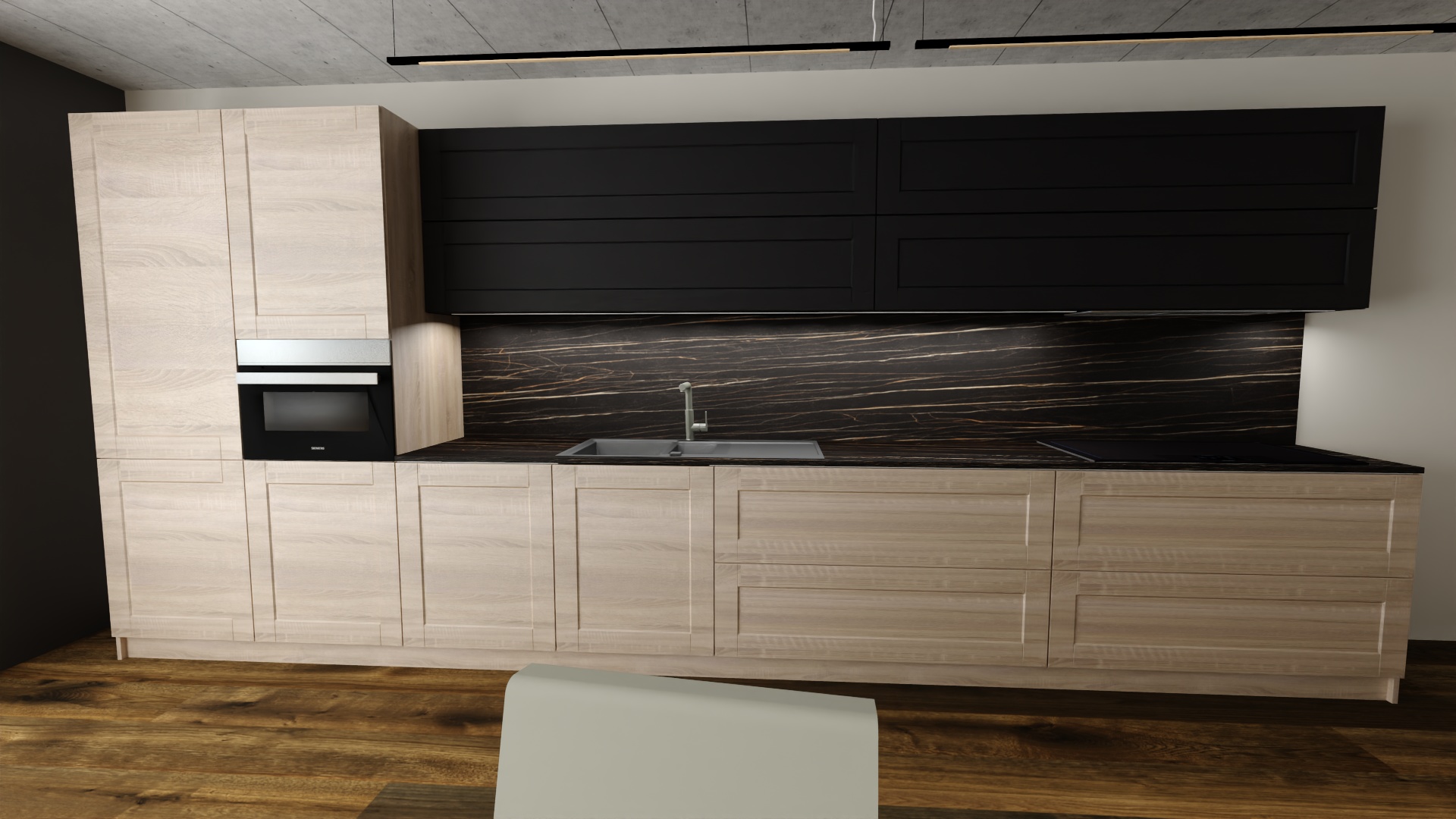 Projekt aranżacji kuchni ze spiekiem, frontami drewnianymi z połączeniem frontow lakierowanych. Różne warianty oświetlenia pozwalają zaobserwować jak doświetlone może być pomieszczenie i kuchniaw świetle dziennym, nocnym i słonecznym. Adaptacja podłogi to ważny element wykończenia, demonstruje równowagę pomiędzy płytkami a wykończeniem w drewnie.